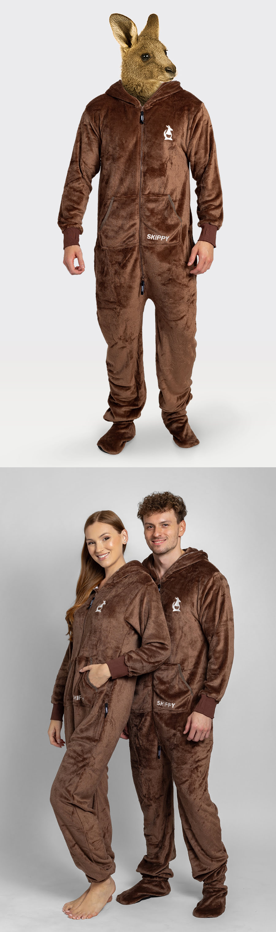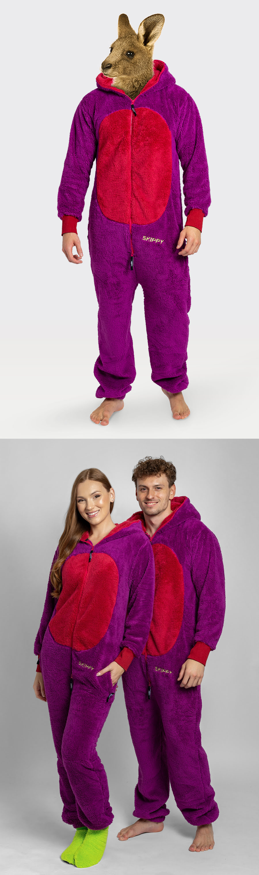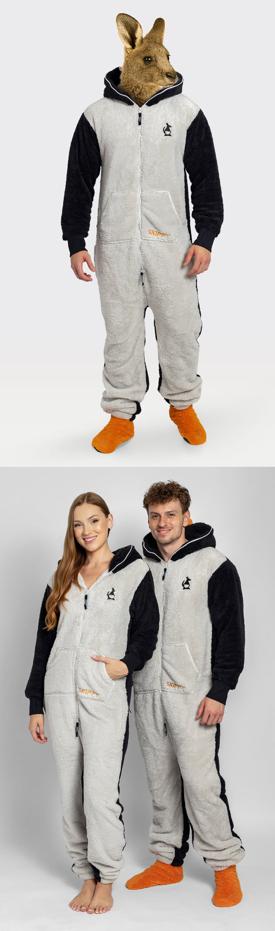 Skippy Onesies sind der originelle Ganzkörper-Overall, in dem man bequem zu Hause faulenzen oder auf einen verrückten Spaziergang oder eine Party gehen kann :) Jeder Onesie hat eine Känguru-Tasche auf der Vorderseite, zwei Seitentaschen mit Reißverschluss und eine Kapuze, die vollständig mit Reißverschluss geschlossen werden kann! Außerdem bekommst du von uns zu jedem Onesie ein Paar rutschfeste Hausschuhe gratis dazu. Bevor Du eine Größe auswählst, sieh Dir unsere Größentabelle an.