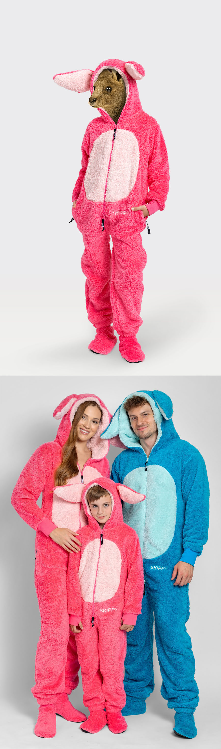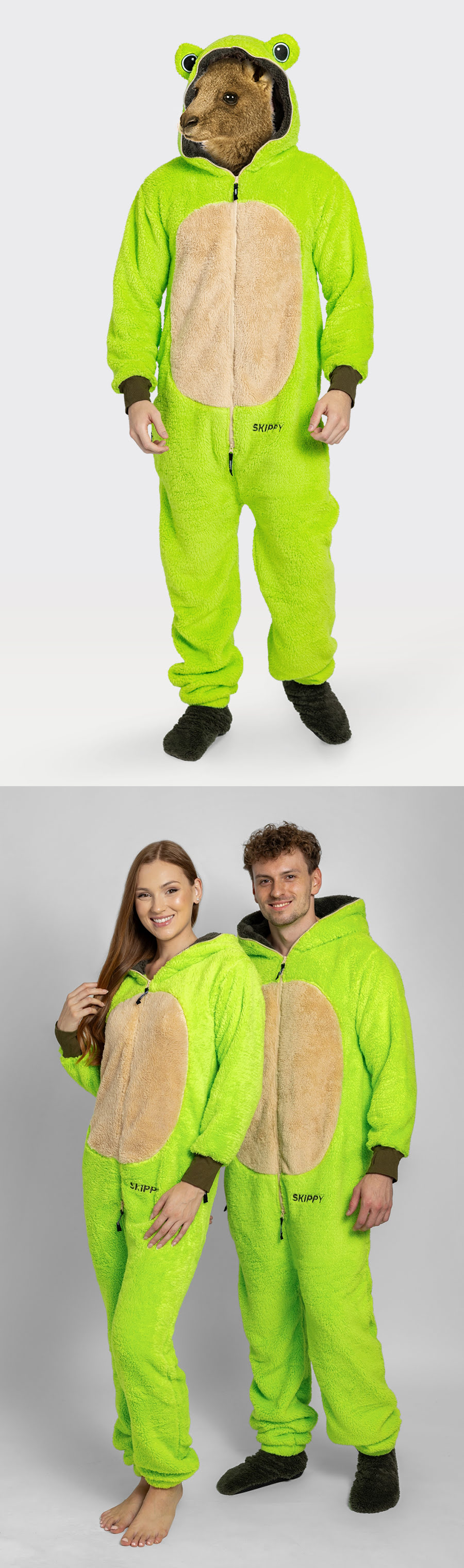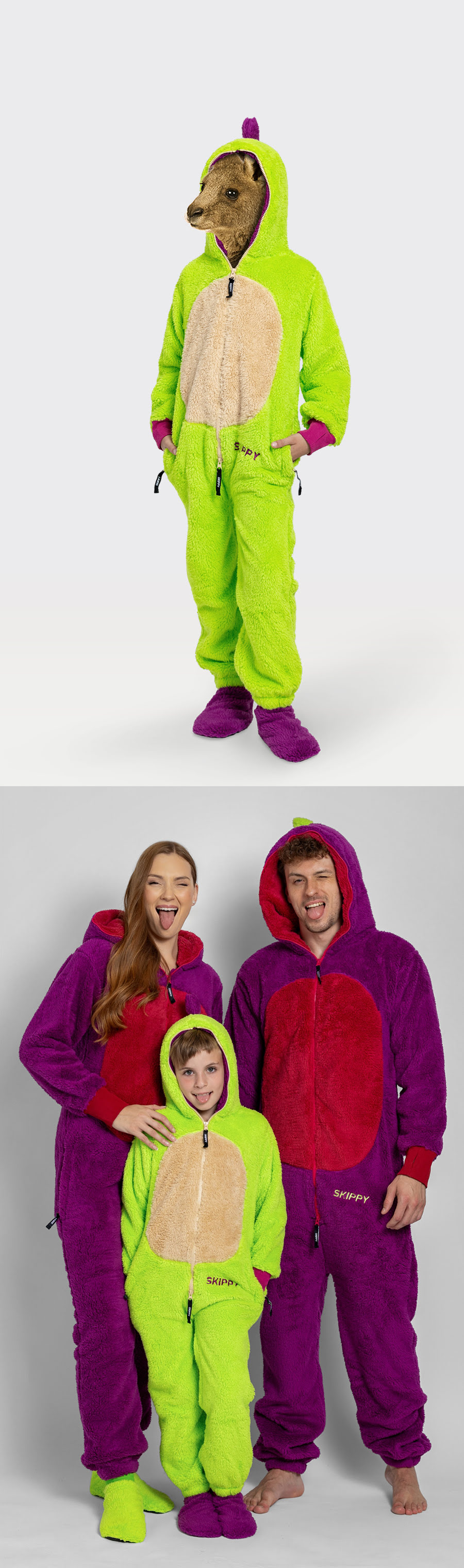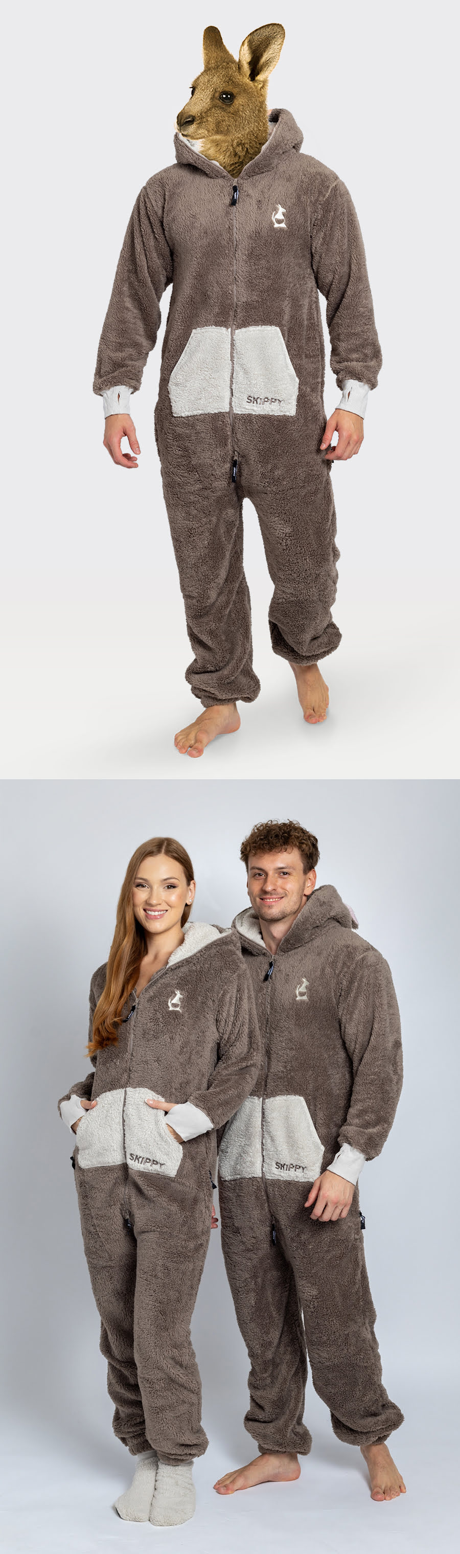 Skippy Onesies sind der originelle Ganzkörper-Overall, in dem man bequem zu Hause faulenzen oder auf einen verrückten Spaziergang oder eine Party gehen kann :) Jeder Onesie hat eine Känguru-Tasche auf der Vorderseite, zwei Seitentaschen mit Reißverschluss und eine Kapuze, die vollständig mit Reißverschluss geschlossen werden kann! Außerdem bekommst du von uns zu jedem Onesie ein Paar rutschfeste Hausschuhe gratis dazu. Bevor Du eine Größe auswählst, sieh Dir unsere Größentabelle an.