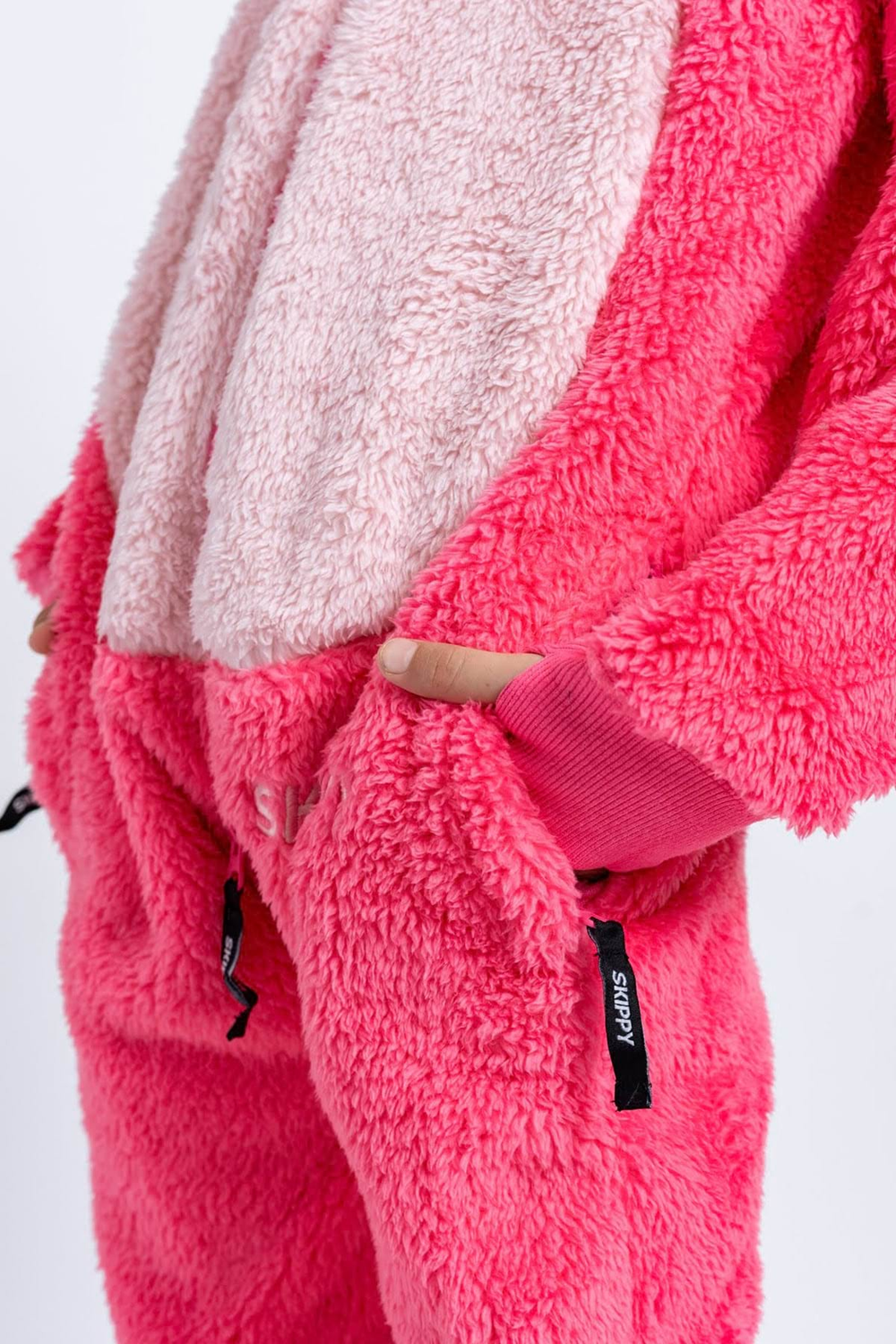 - Zwei Seitentaschen mit Reißverschluss, Kapuze mit Öhrchen