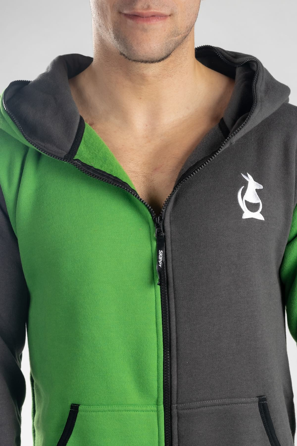 - Langer 2-Wege-Reißverschluss, der bis zur Kapuze geschlossen werden kann