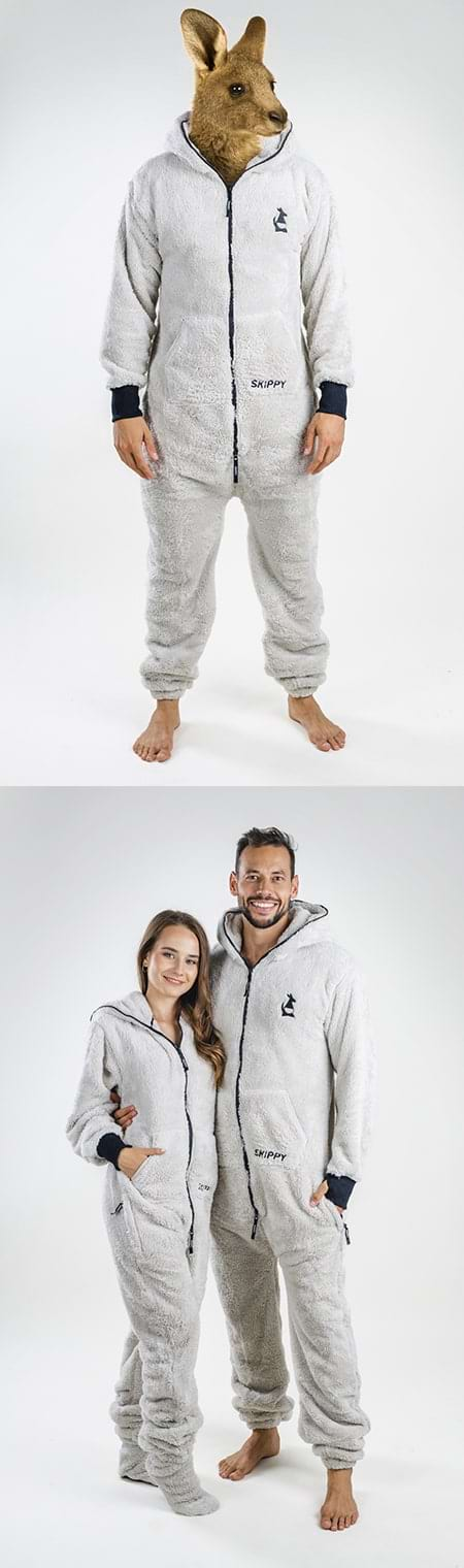 Zu jedem Onesie gibt es ein Paar Hausschuhe mit rutschfesten Sohlen als Geschenk.