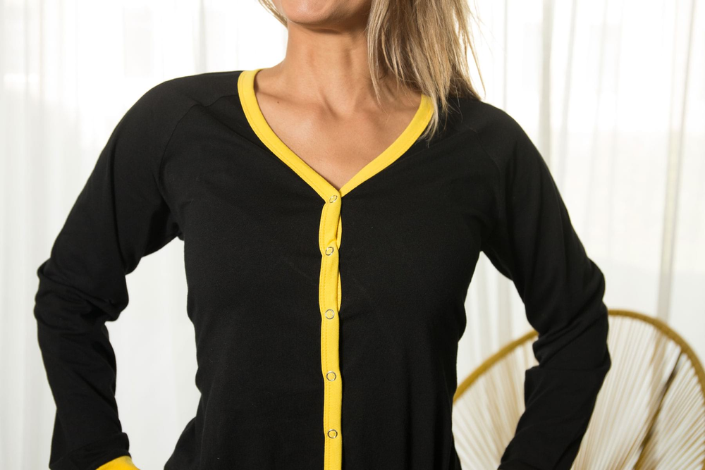 Manchmal, zum Beispiel beim Stillen, ist ein tieferer Ausschnitt praktisch. Dafür dienen die Metalldruckknöpfe.